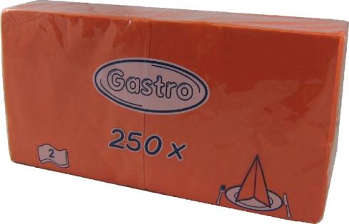 Servítky 33x33cm 2-vrstvové 4f 250ks oranžové určené na profesionálne použitie v gastro prevádzke. Rozmer/objem: 33 × 33 cm. Počet bal. v kartóne: 12. Vhodné pre reštaurácie, bistrá, kaviarne aj rozvoz.